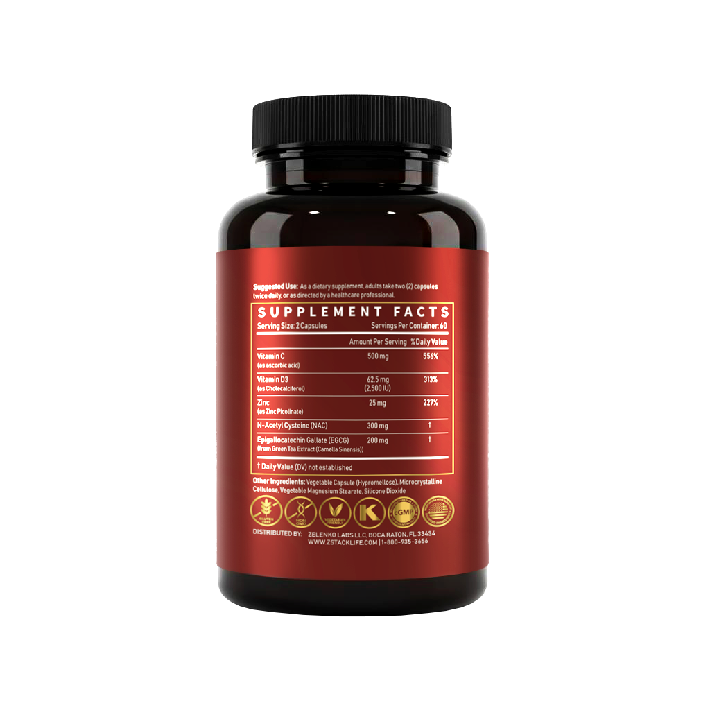 Vitamin C, Zinc, and EGCG enhance immune system defense against threats.
